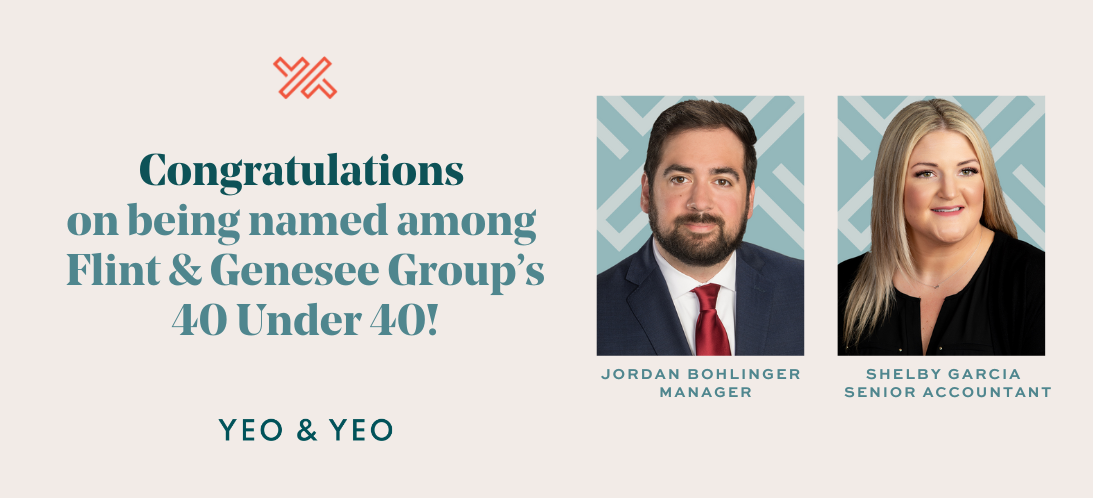 Yeo & Yeo, a leading Michigan advisory firm, is pleased to announce that Jordan Bohlinger and Shelby Garcia were recently recognized in the 2024 Flint & Genesee Group’s 40 Under 40. The program highlights individuals under age 40 who demonstrate a commitment to excellence and a passion for making a difference in the community.